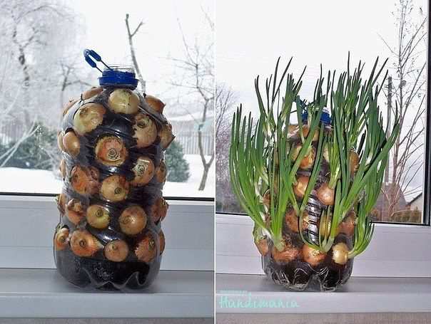 | Идея отличная! Я родителям делала такую грядку пару лет назад Только у меня тара поменьше была, 1,5 литровая бутылка. Из личного опыта могу сказать, что при поливе вода вытекает из дырочек. Нужна подставка, а дырки для лука делать как можно меньше по размеру.